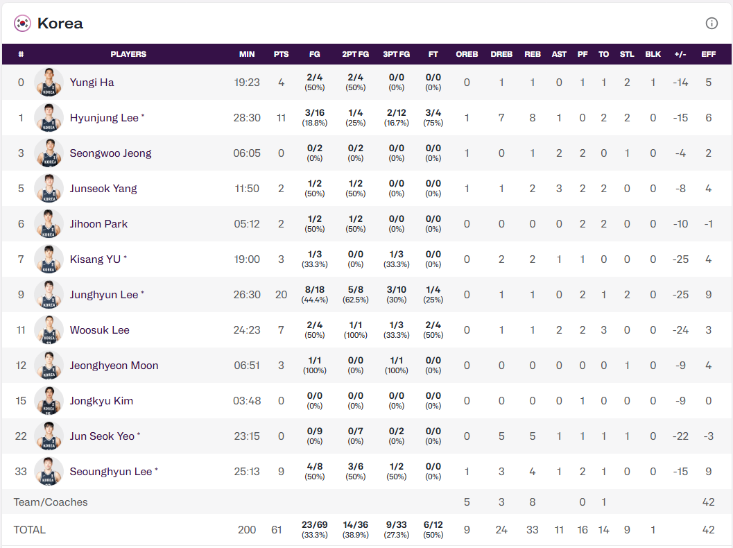 여준석의 무득점(0점 5리바운드) 에서 볼 수 있듯이 여준석의 미비한 활약이 뼈아팠고